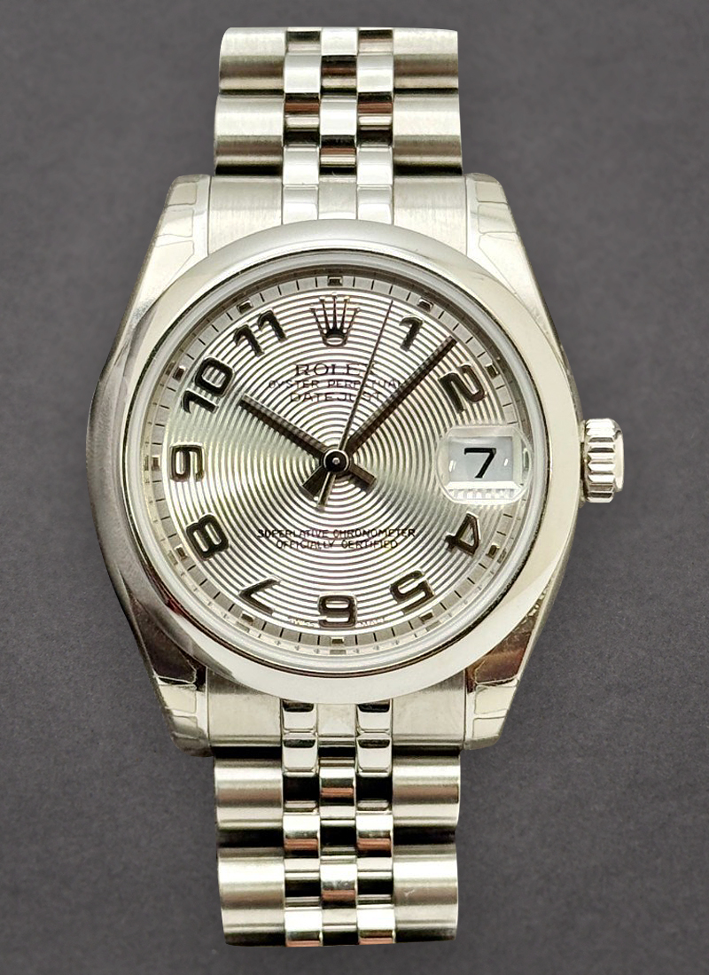 MidSize Datejust in Steel with Smooth Bezel on Jubilee Bracelet with Silver Concentric Dial with Arabic Numerals 178240