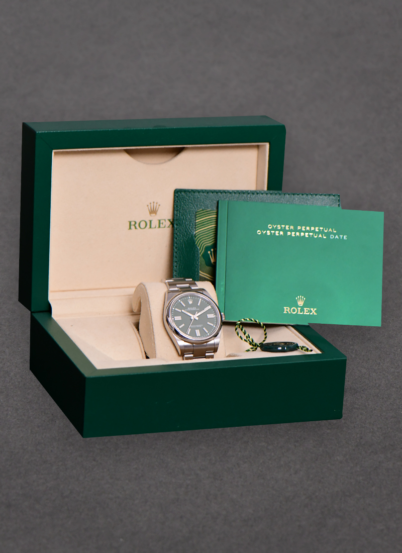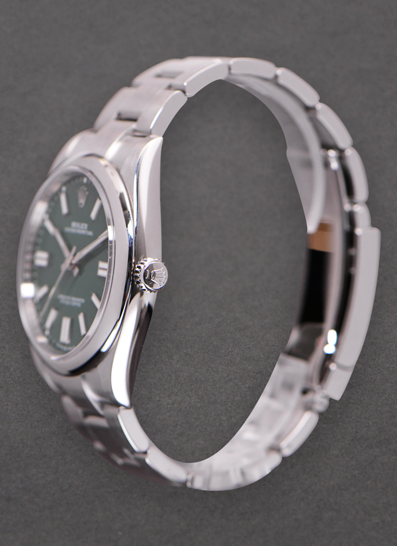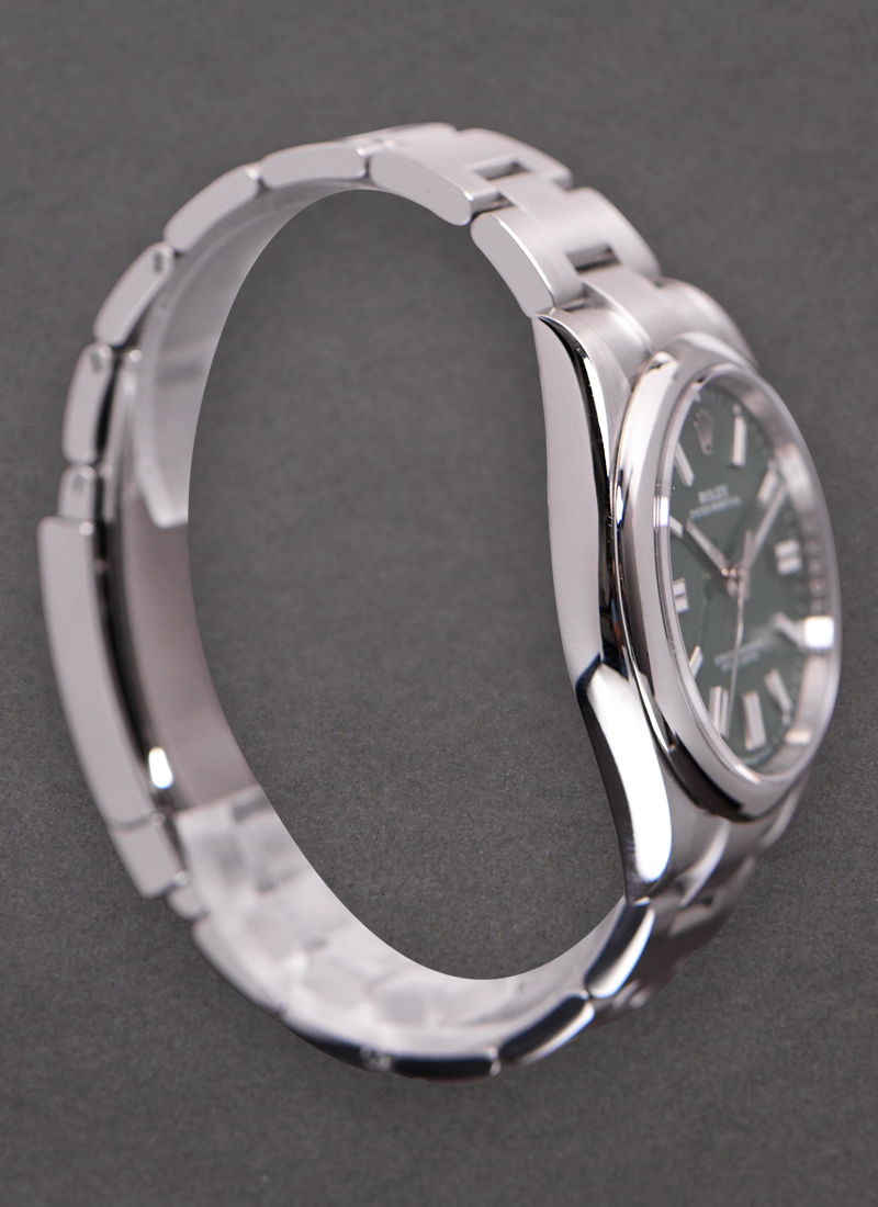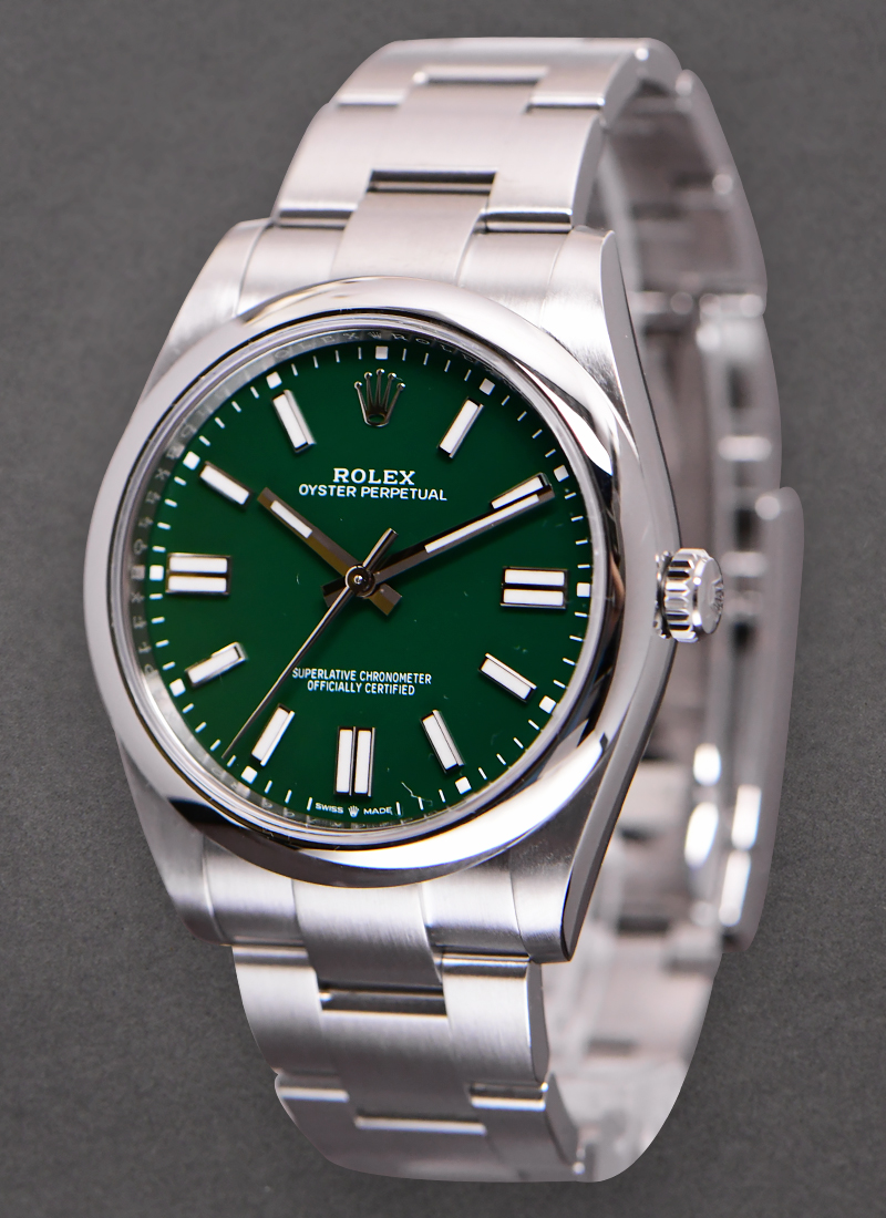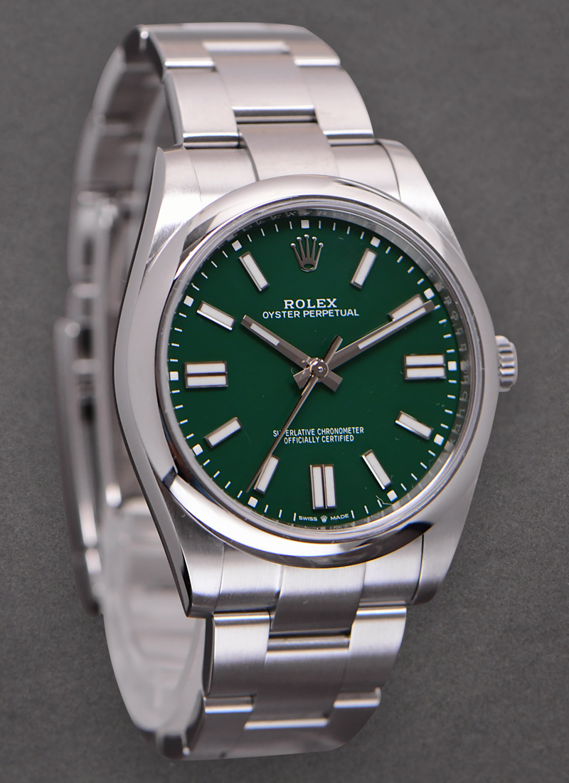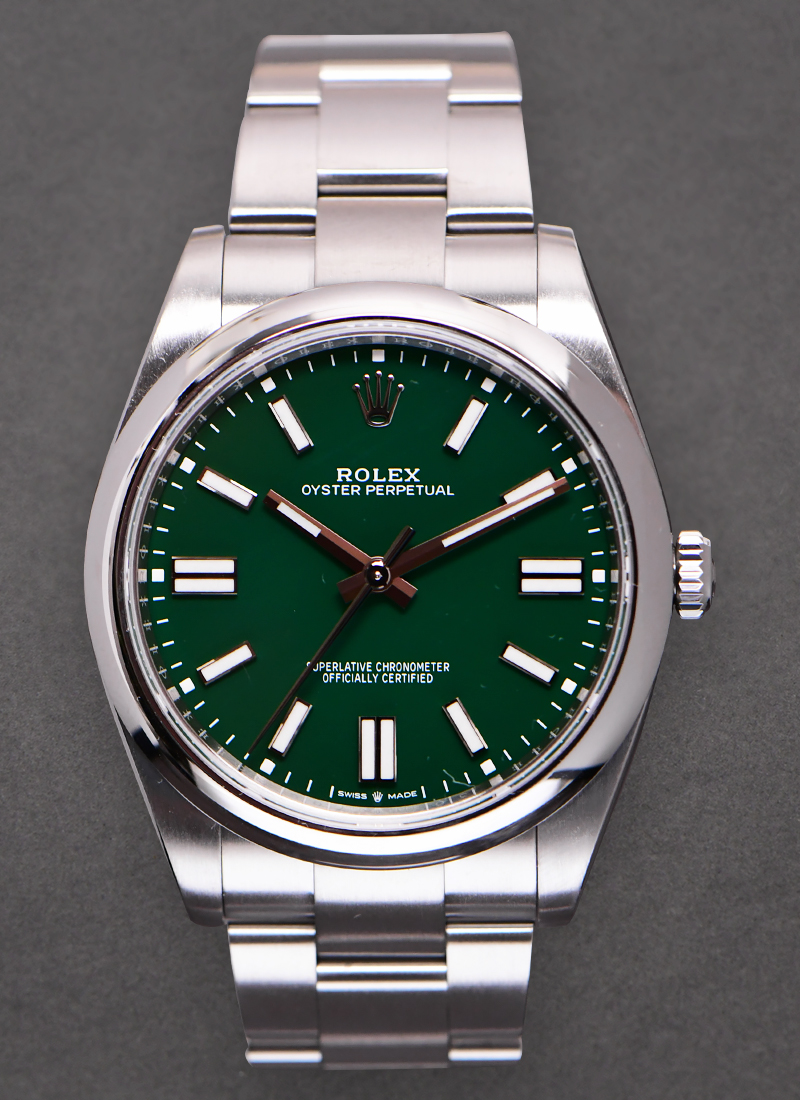 Oyster Perpetual 41mm in Steel with Domed Bezel on Oyster Bracelet with Green Stick Dial 124300
