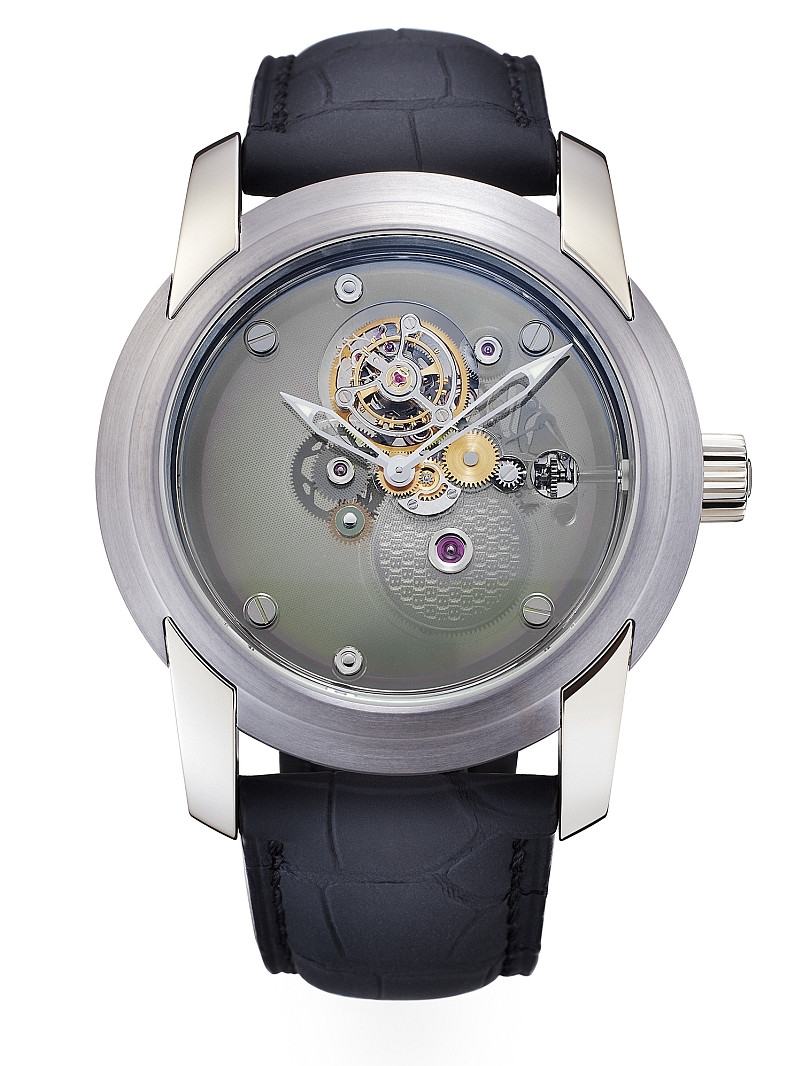 In house manufactured mechanical hand wound one minute flying carrousel movement with 120 hours power reserve-Case 43.5mm in tantalum with white gold lugs-Visible caseback-Sapphire transparent dial-Black alligator strap with white gold tongue buckle-Water resistance 30m.