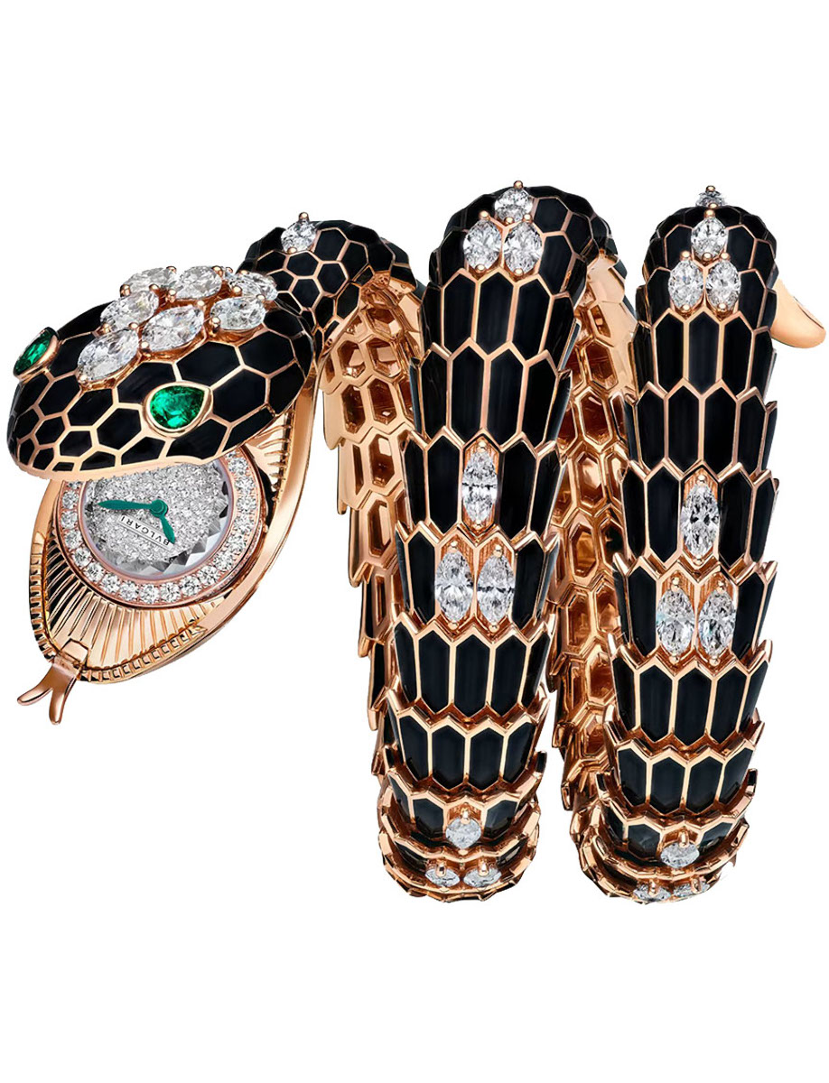 Serpenti Secret Watch 40mm in Black Lacquered Rose Gold with Diamonds on Spiral Black Lacquered Rose Gold Bracelet with Snow-Set Diamond Dial 103884