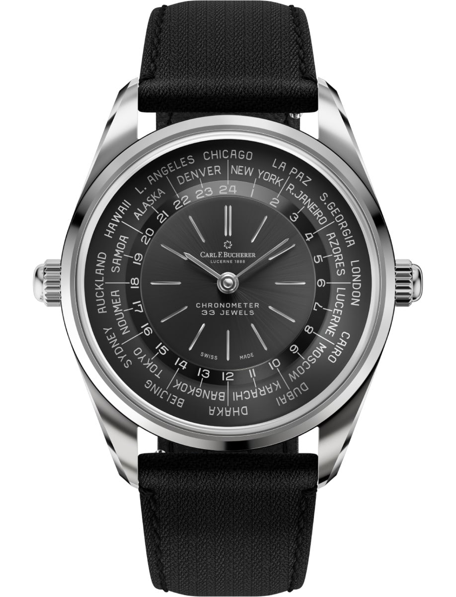 Heritage Worldtimer 39mm in Steel on Black Textile Strap with Black Dial 00.10805.08.33.01