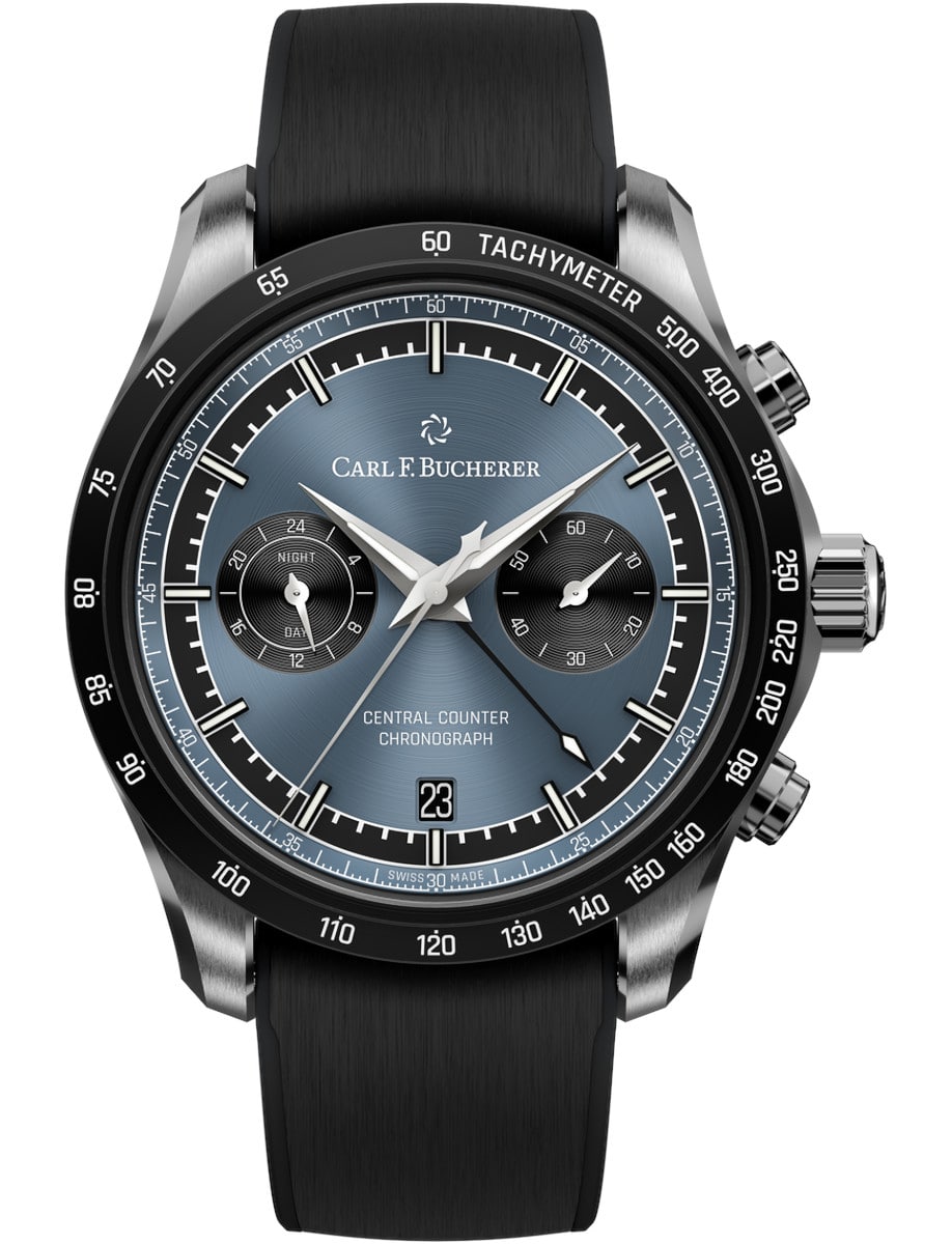 Manero Central Counter 42.5mm in Steel with DLC Coated Bezel on Black Rubber Strap with Blue Dial 00.10923.08.53.01