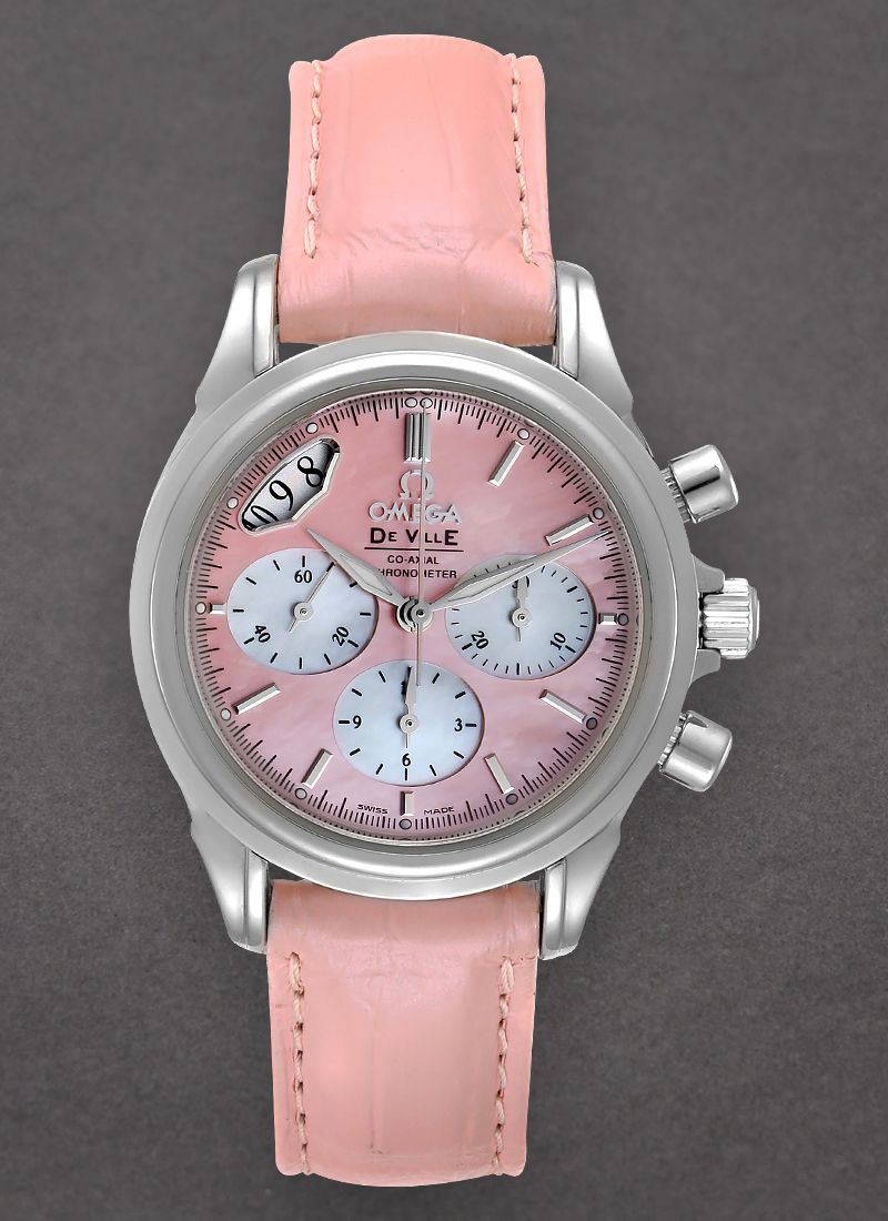 * Stainless steel case * Pink crocodile leather strap * Pink Mother of Pearl dial with Index hour markers * Displays Date between 10 and 11. * Omega Caliber 3313, Co-Axial Escapement for greater precision stability and durability * 52 hour Power Reserve