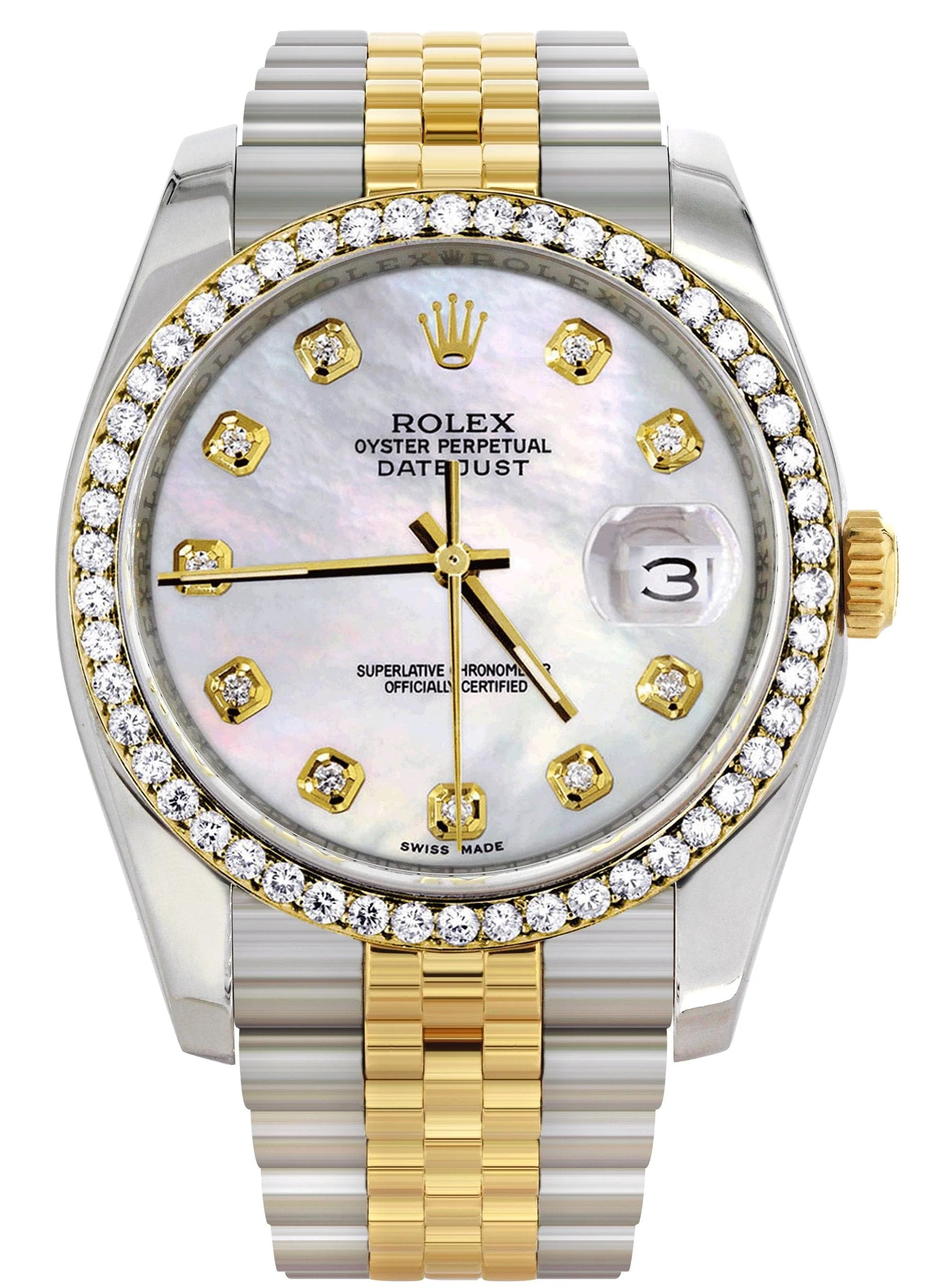 Datejust 36mm in Steel with Yellow Gold Fluted Bezel on New Style Jubilee Bracelet with White MOP Diamond Dial 116233