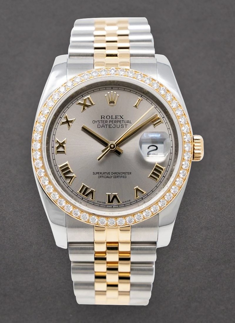 2-Tone Datejust 36mm with Diamond Bezel on Jubilee Bracelet with Steel Roman Dial 116243