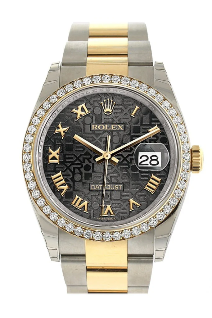 Datejust 36mm in Steel with Yellow Gold Diamond Bezel on Oyster Bracelet with Black Jubilee Roman Dial 116243