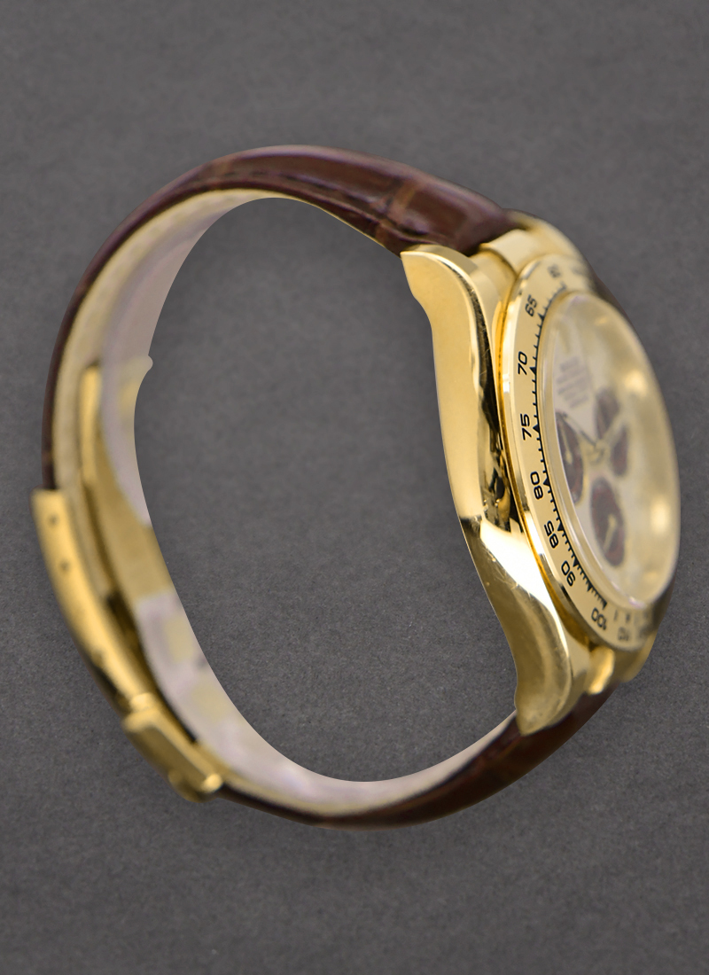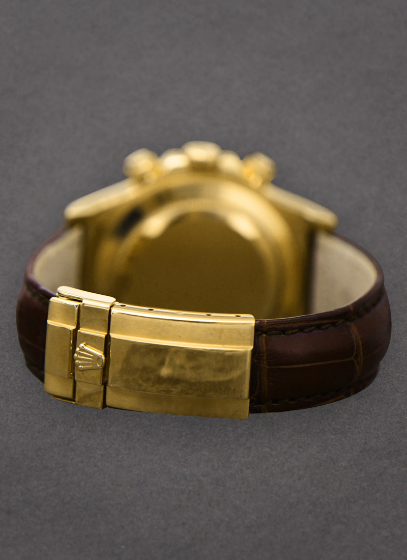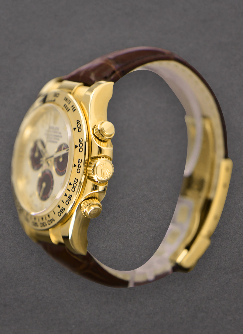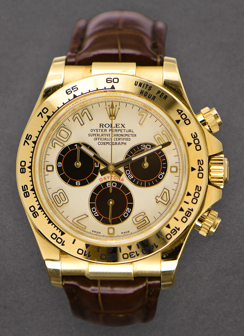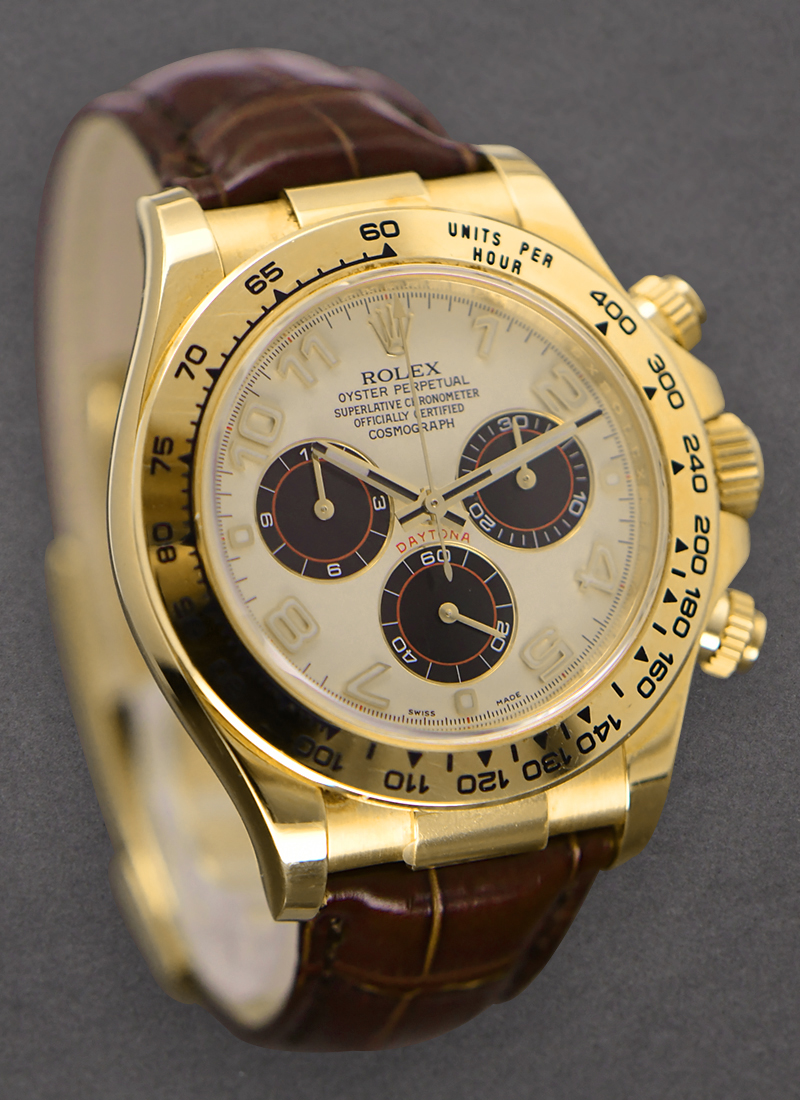 Daytona in Yellow Gold on Black Strap with White Arabic Dial 116518