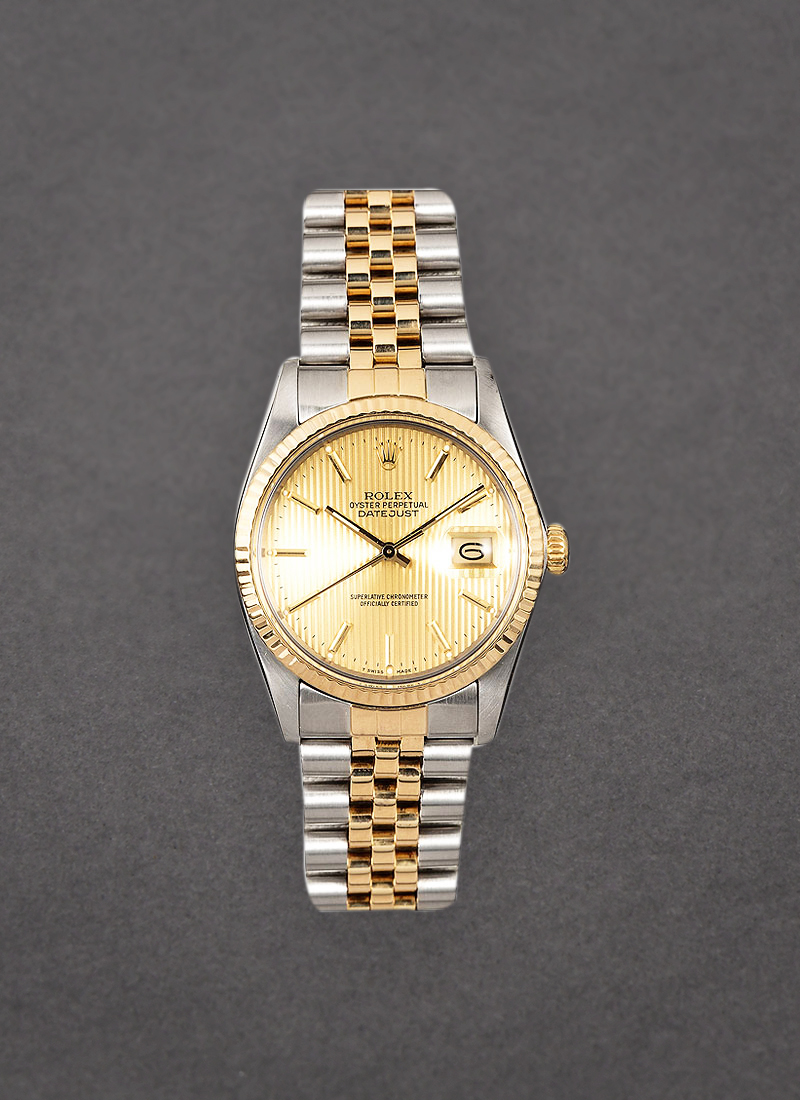 2-Tone Datejust 36mm with Yellow Gold Fluted Bezel on Jubilee Bracelet with Champagne Tapestry Stick Dial 16233