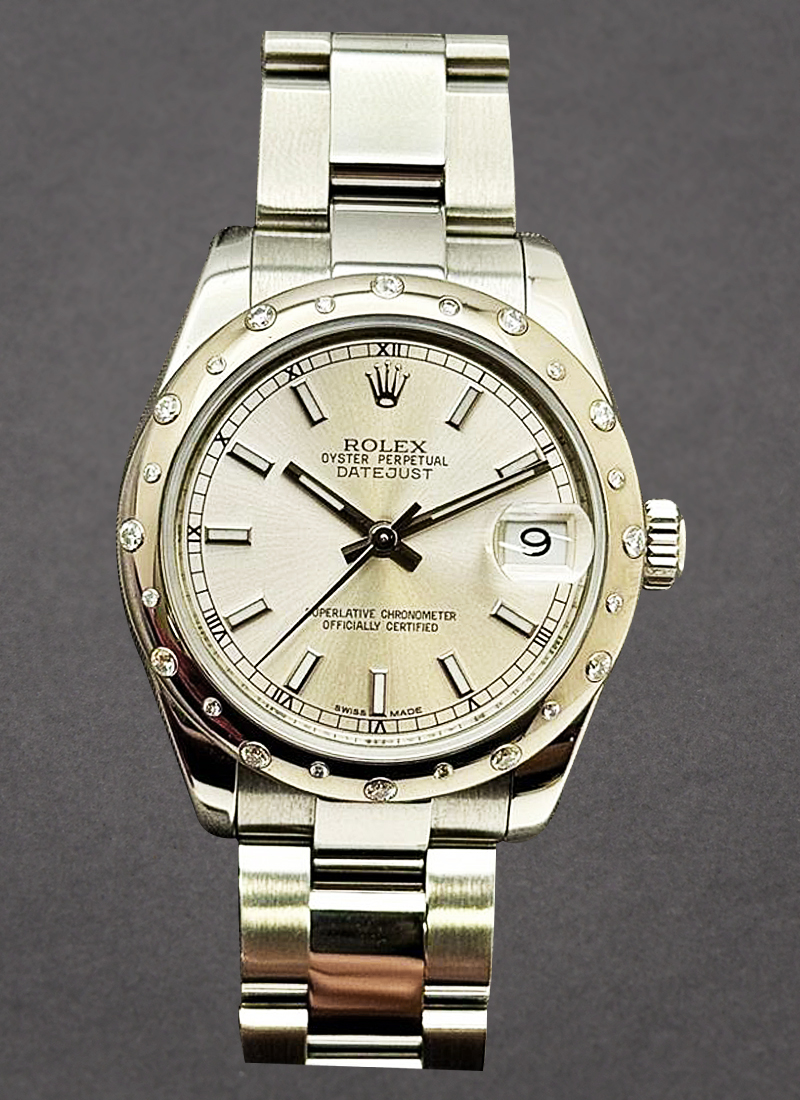 Datejust 31mm in Steel with White Gold Scattered Diamond Bezel on Oyster Bracelet with Silver Index Dial 178344