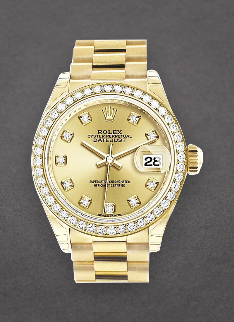 President 28mm in Yellow Gold with Diamond Bezel on Yellow Gold President Bracelet with Champagne Diamond Dial 279138