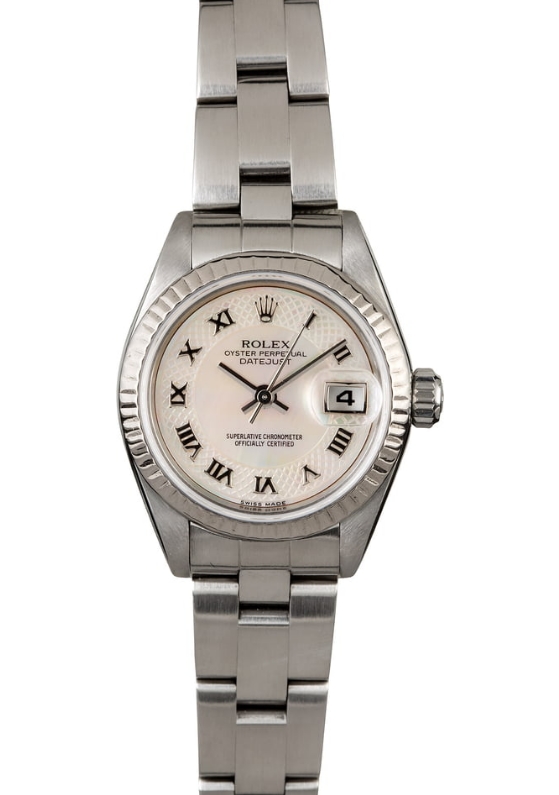 Ladies Datejust 26mm in Steel with White Gold Fluted Bezel on Oyster Bracelet with Mother of Pearl Roman Dial 79174