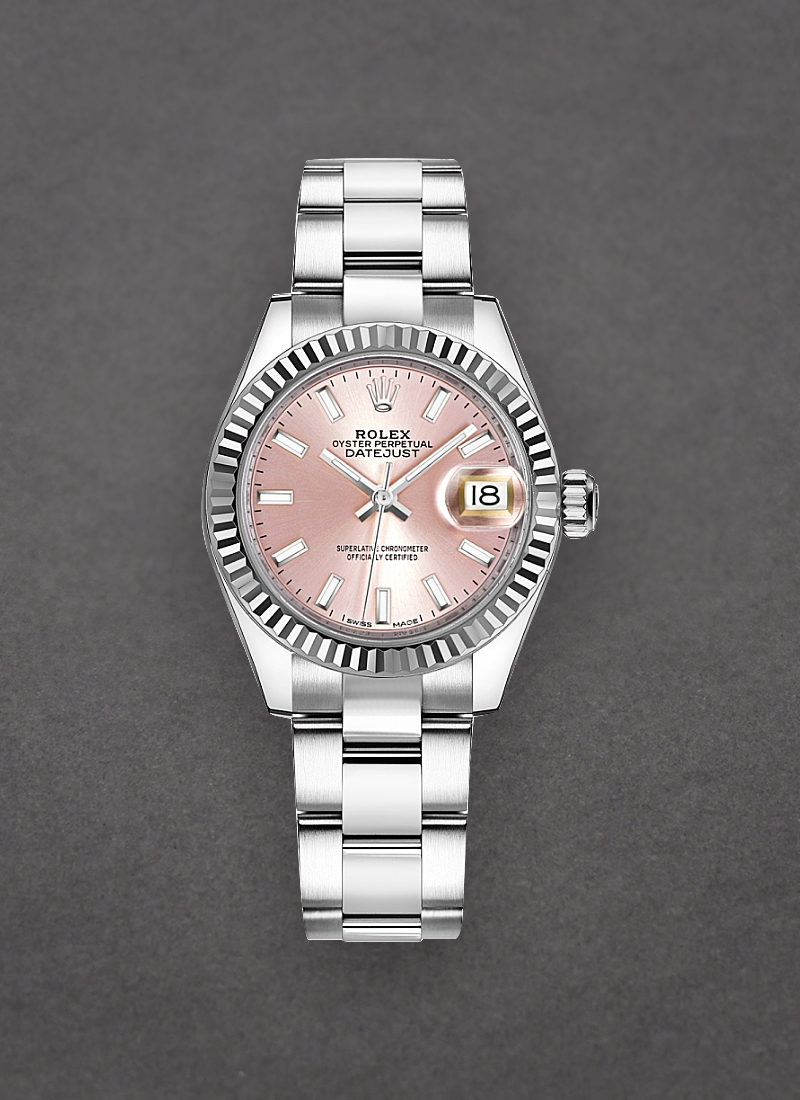 Ladies Datejust 28mm in Steel with White Gold Fluted Bezel on Oyster Bracelet with Pink Stick Dial 279174
