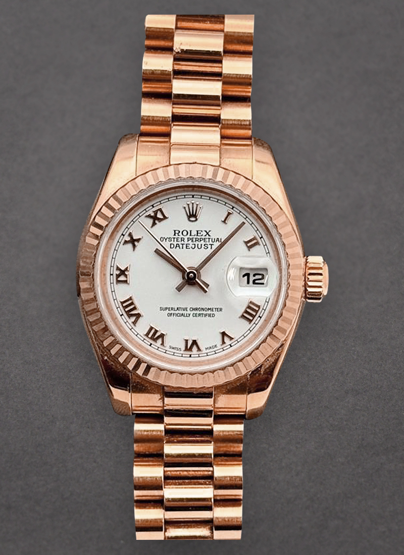 Ladies President in Rose Gold with Fluted Bezel on Rose Gold President Bracelet with White Roman Dial 179175