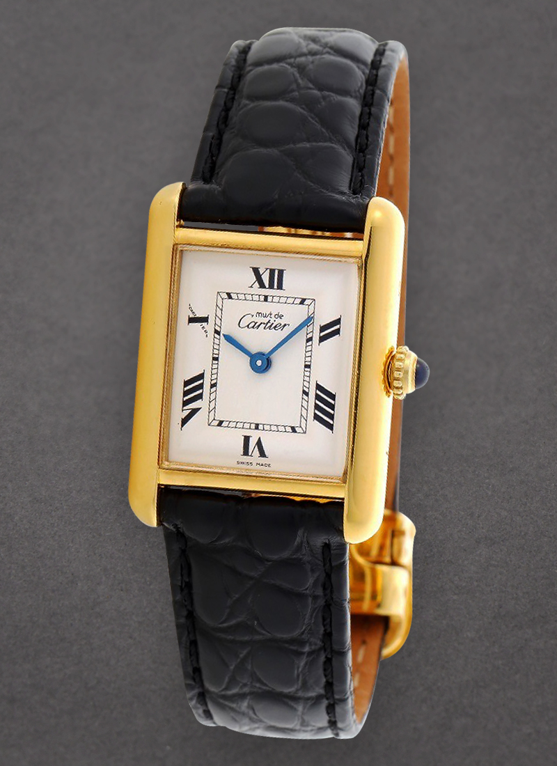Tank Must De Cartier in Gold Plated Steel on Black Crocodile Leather Strap with Silver Dial W1013654