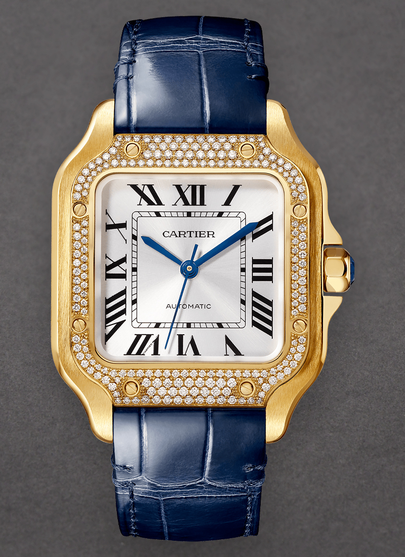 Santos de Cartier Large 40mm in Yellow Gold with Diamond Bezel on Blue Alligator Leather Strap with Silver Dial WJSA0008