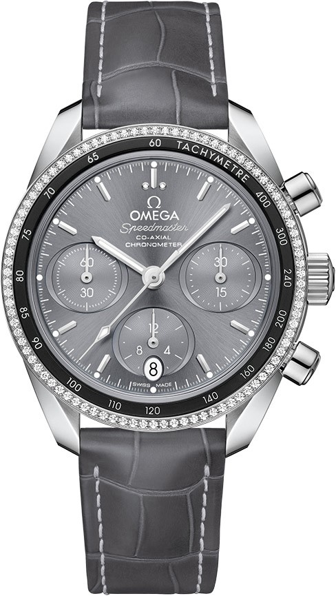 Speedmaster Co-Axial Chronograph 38mm in Steel with Diamonds and Inner Black Aluminum Bezel on Grey Alligator Leather Strap with Grey Dial 324.38.38.50.06.001