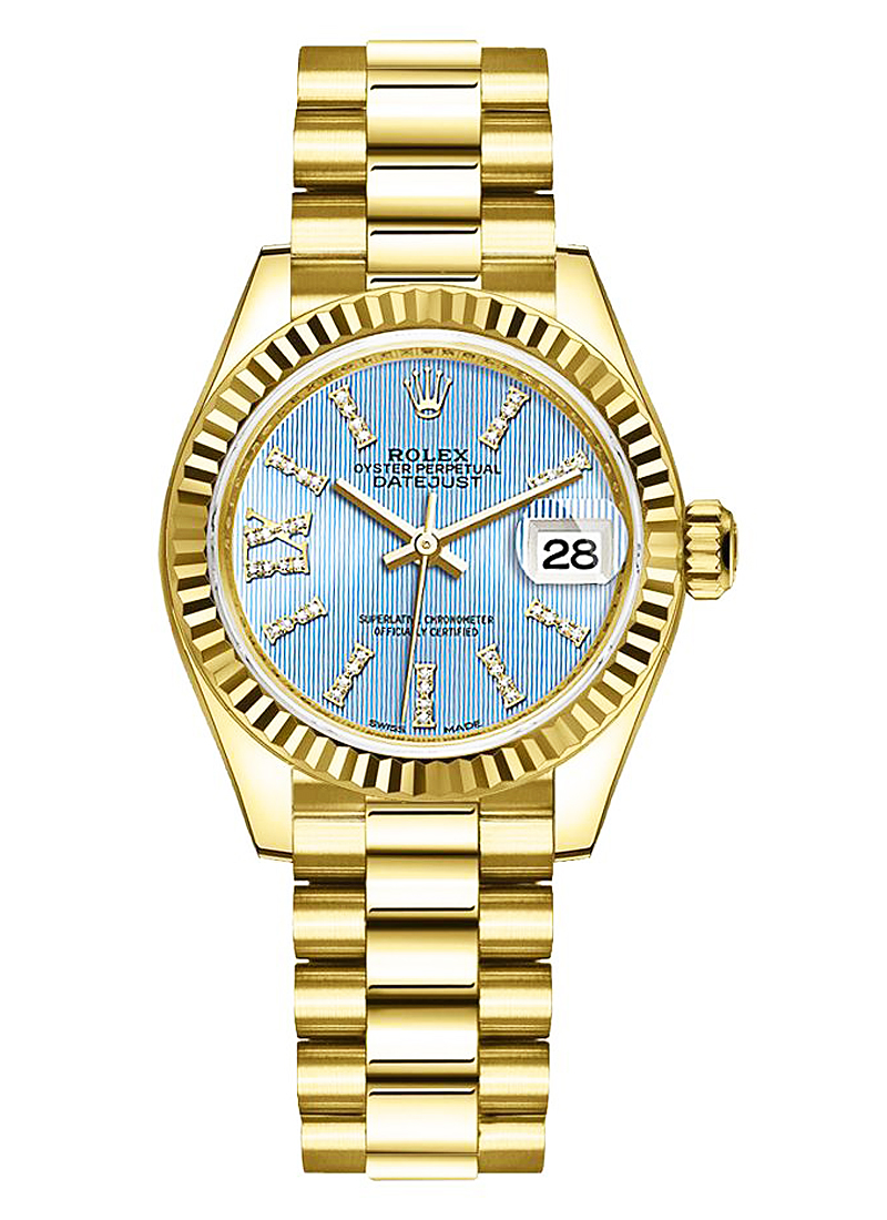 Ladies President in Yellow Gold with Fluted Bezel on Yellow Gold President Bracelet with Cornflower Blue Diamond Dial 279178