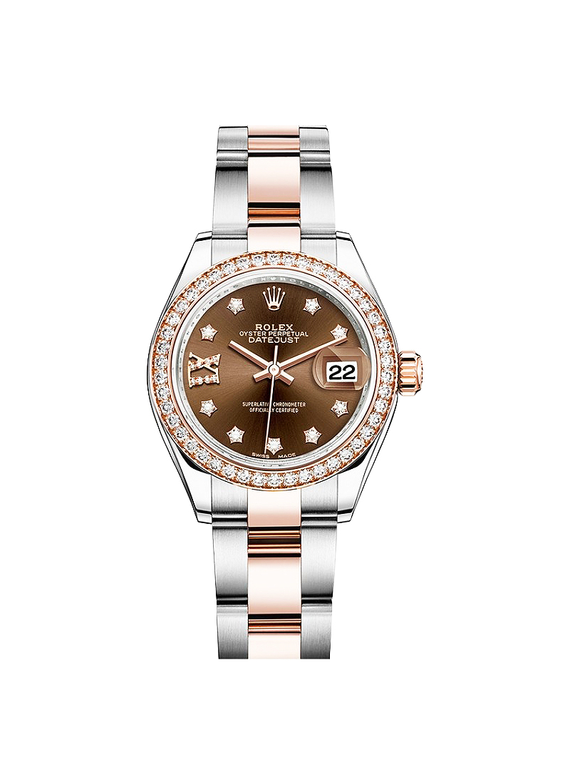 Datejust 28mm in Steel with Rose Gold Diamond Bezel on Oyster Bracelet with Chocolate IX Diamond Dial 279381